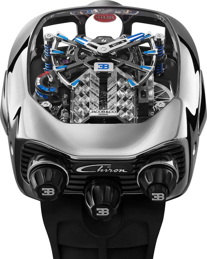The exterior shape of the Bugatti Chiron exudes power and performance. Jacob & Co. took inspiration from this sculpture to create the case of the Bugatti Chiron Tourbillon. The case is a glass and metal volume whose structural elements echo the Chiron’s unique design in the signature horseshoe Bugatti grille, the quarter glass, the muscular bodywork, and the haunting headlights. Jacob & Co. reinterpreted it all with a unique sense of design and exhilaration all the way down to the movement, visible through seven sapphire panels. Its automaton is a direct reference to Bugatti’s W16 engine block. Its power reserve is shaped like a fuel gauge, its tourbillon carriage like a radiator, and its structure like exhaust pipes.